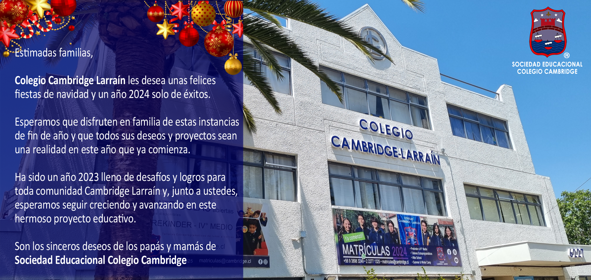 Colegio Cambridge Larraín les desea unas felices fiestas de navidad y un año 2024 solo de éxitos.